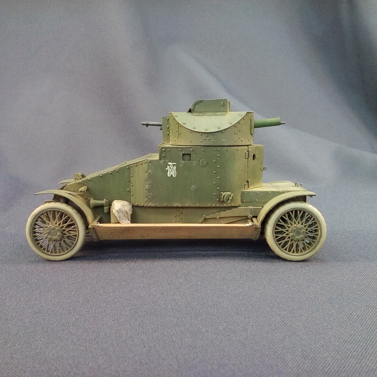 Решение просто собрать модель из коробки, без доработок и переделок не получилась. Как всегда, начав разбираться в матчасти, понял, что без переделок и дополнений не обойтись. Заменил 37 мм пушку Гочкиса на 3D печатную. Замена пулемета Виккерса на Максим. Переделал двери немного подняв их наверх, а также заменил петли на них. Добавил отсутствующие заклепки на корпус и башню. Добавил заслонку в башне. Заменил пластиковые доски на деревянные и добавил крепление из крючков и ремней. Доработал крепление запасного колеса. Добавил шанцевый инструмент. Доработал смотровые щели на корпусе. Заменил защиту корпуса и переделал амбразуру под пулемет. Модель окрашена красками Тамия, химия и эффекты от AK и MIG, пигменты от Хаси-Моделиста и AK.