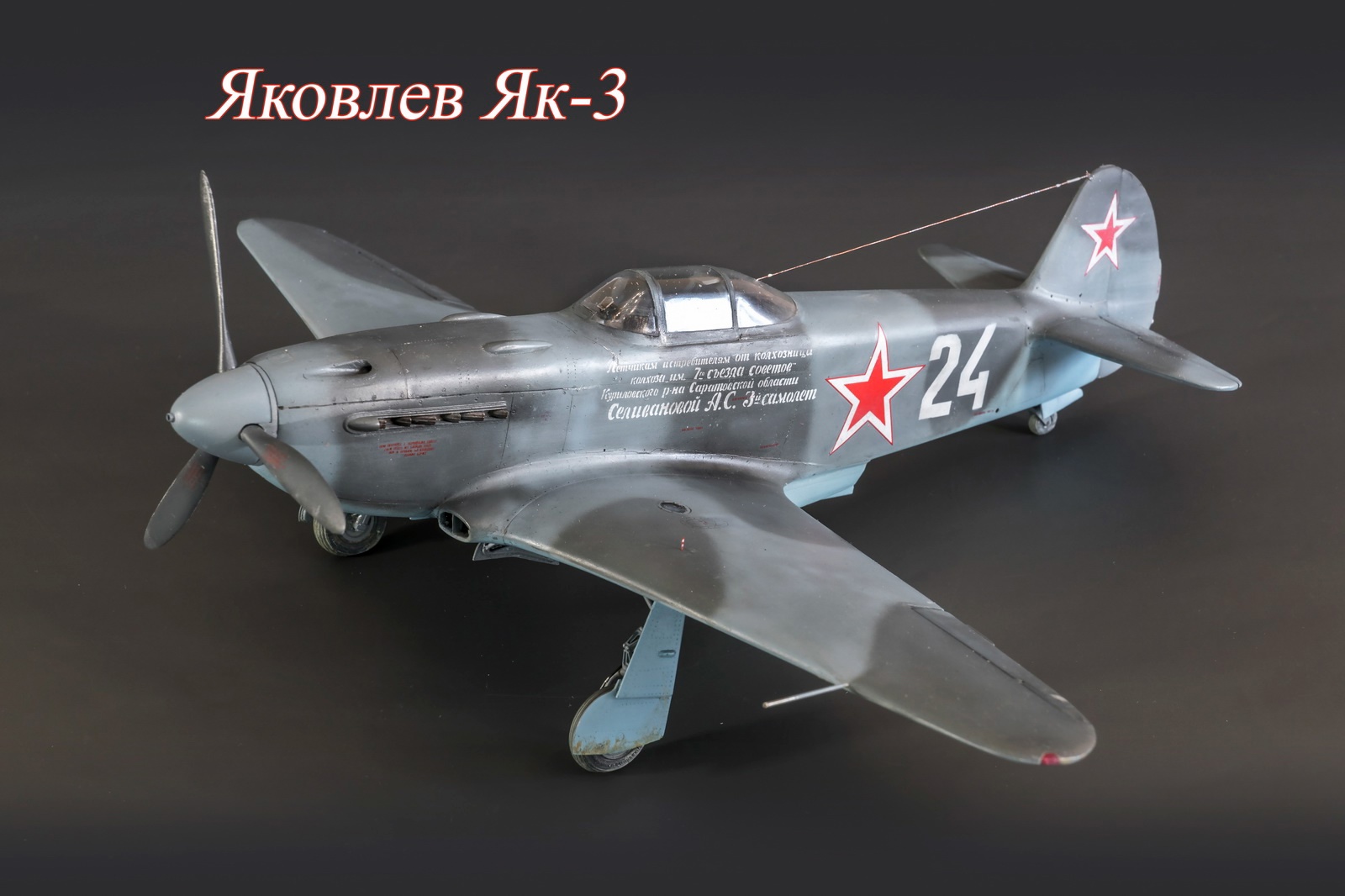 Модель Як-3 фирмы SH в 32 масштабе оказалась достаточно сложной в работе. Очень много неточностей, которые вынужден был переделывать. Это неверен фюзеляж за фонарём, узкий фюзеляж, неверны обводы носовой части фюзеляжа, форма водорадиатора. Заменил лопасти винта, тканевые рулевые поверхности. Использовал декали Бегемот, с которыми пришлось тоже потрудиться. Не всё оказалось так просто. Цвета стандартные на тот период — АМТ-7, 11, 12. Краски автомобильные, нитро.